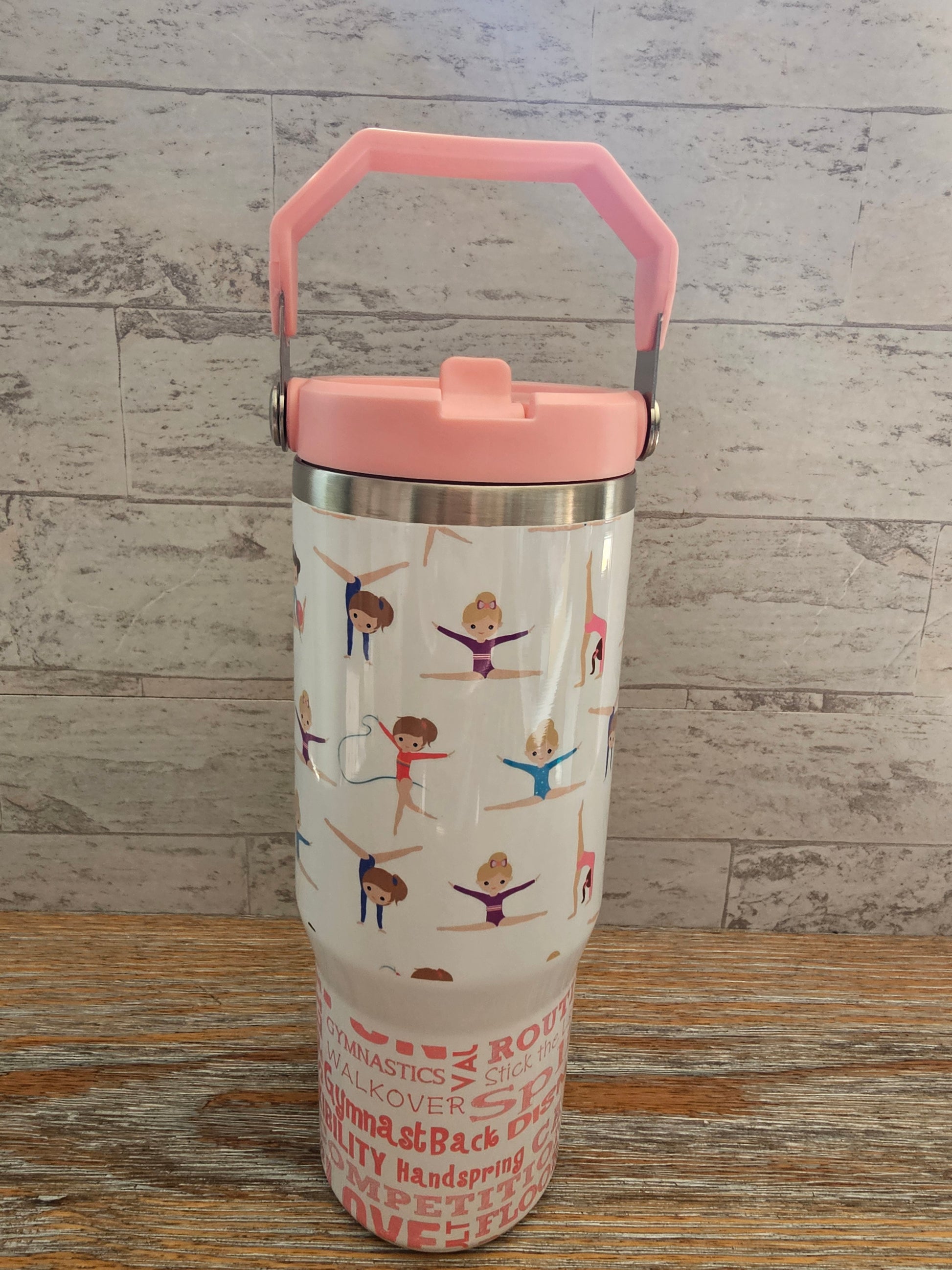 This water bottle features a fun gymnastics themed design. Available with or without personalization! Your choice!