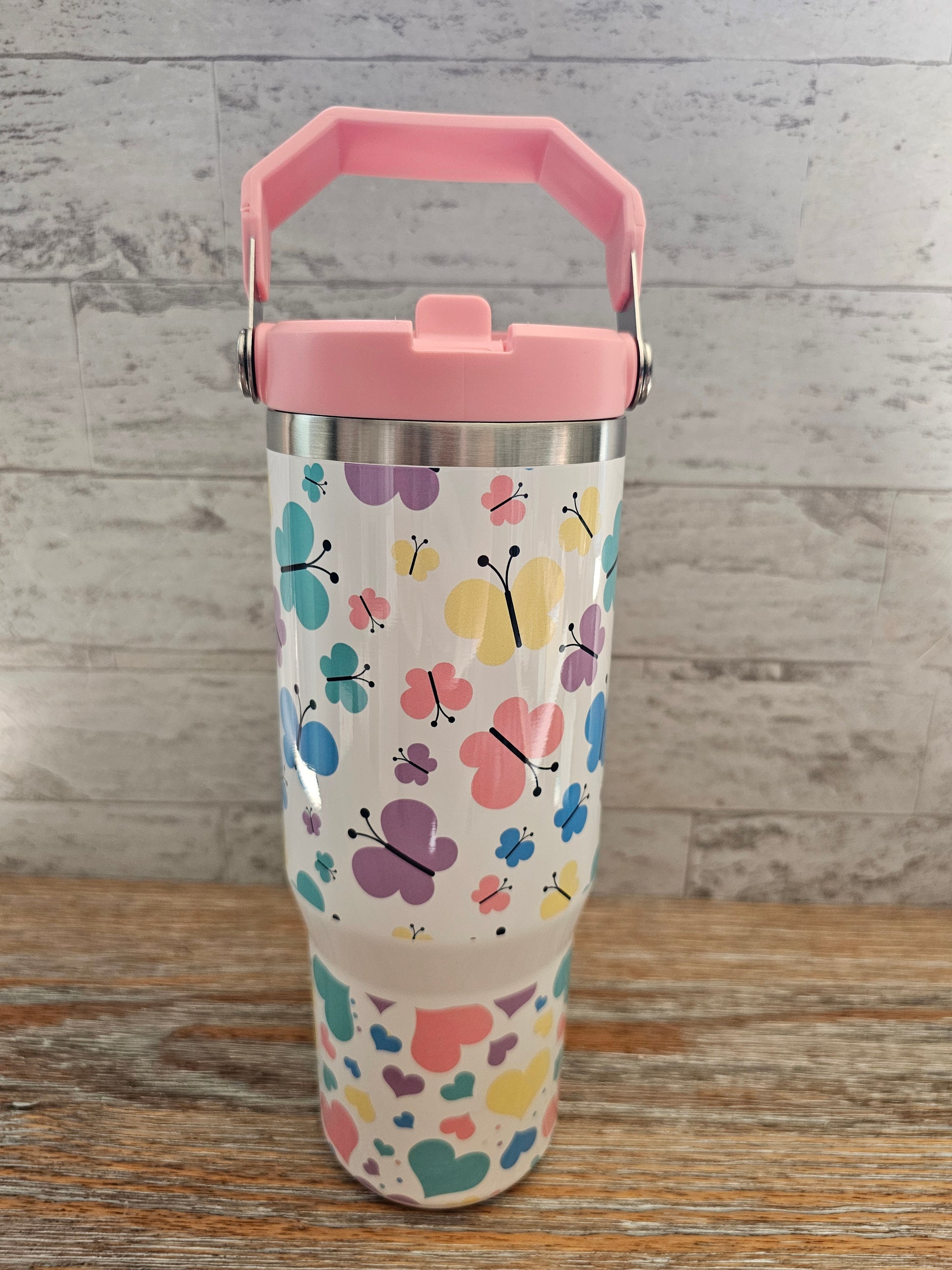 This water bottle features a fun and colorful butterfly design. Available with or without personalization! Your choice!