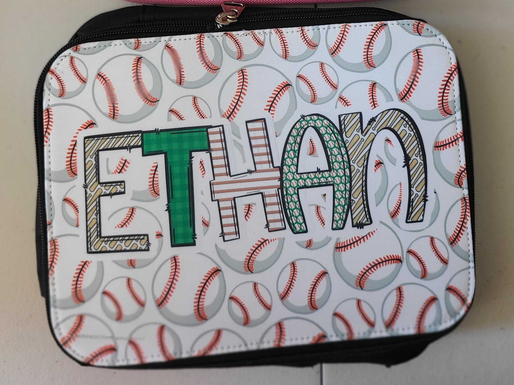 Lunch bag has a baseball background with coordinating font for your child's name on the top with black sides and bottom and a gray interior.
