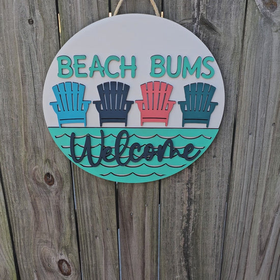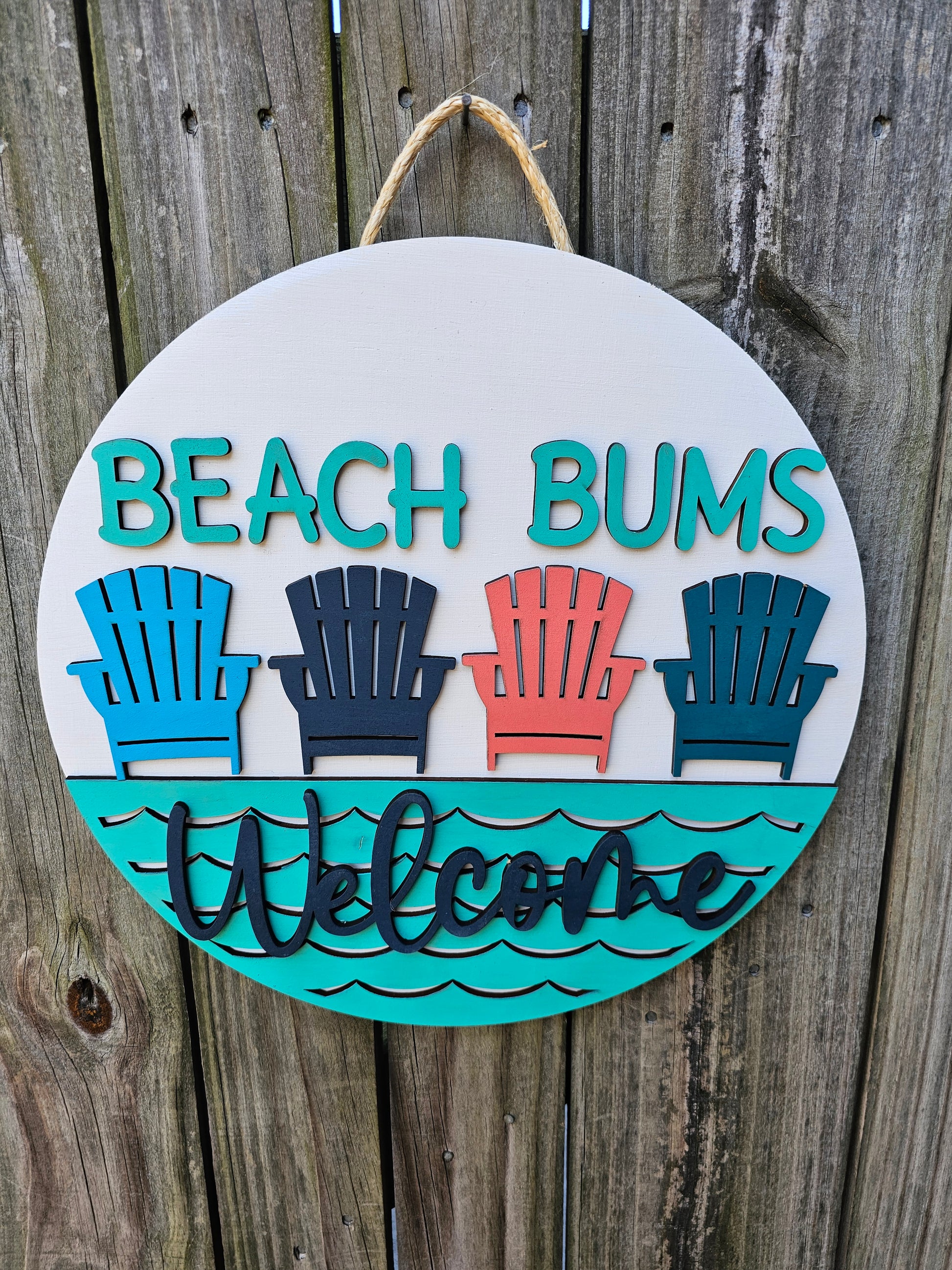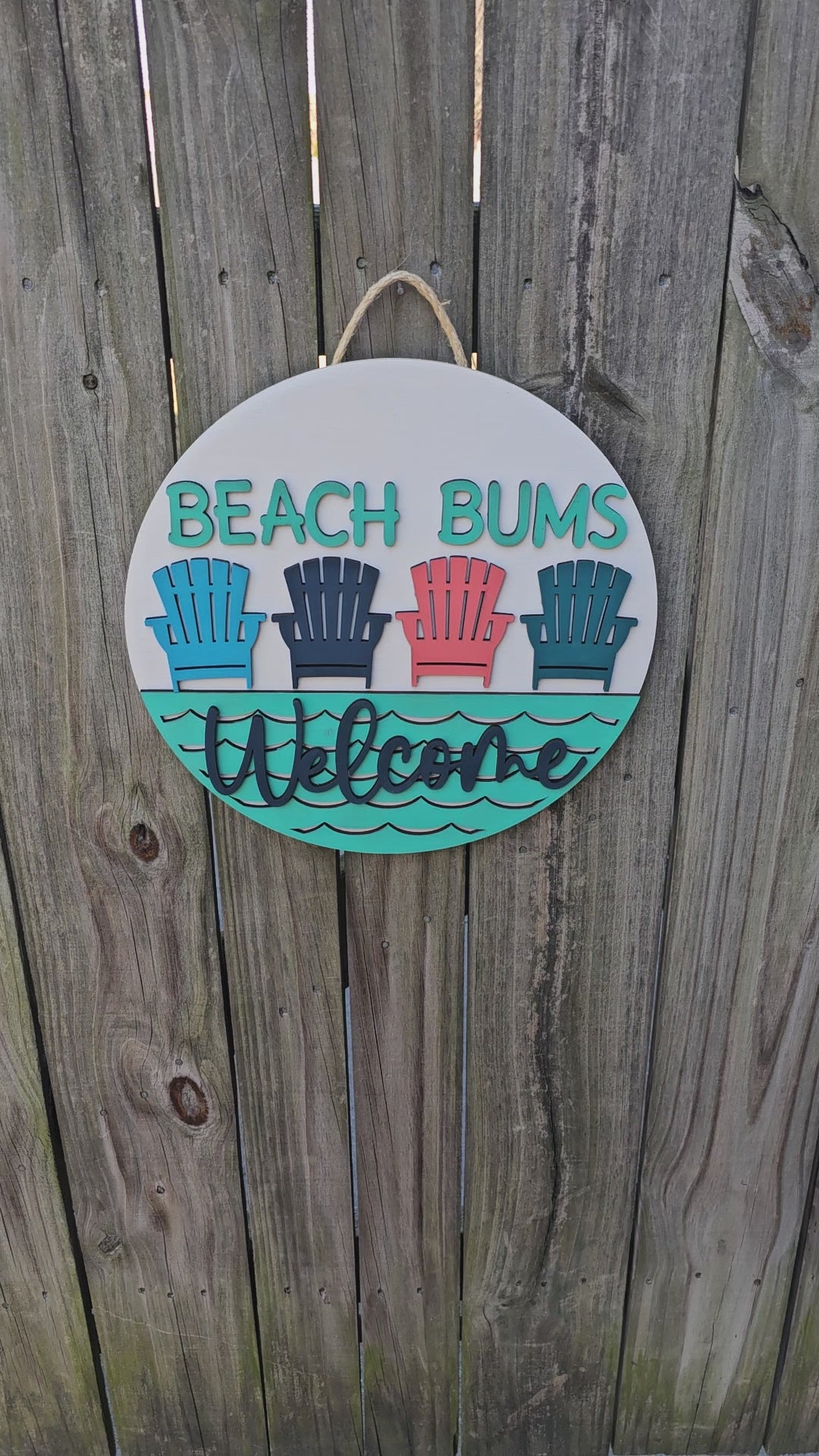 Bring beachy vibes to your home with this fun “Beach Bums Welcome” door sign! Featuring colorful Adirondack chairs, layered lettering, and wave details, this playful design is perfect for lake houses, beach houses, patios, or anyone who lives for sunshine and sand.
