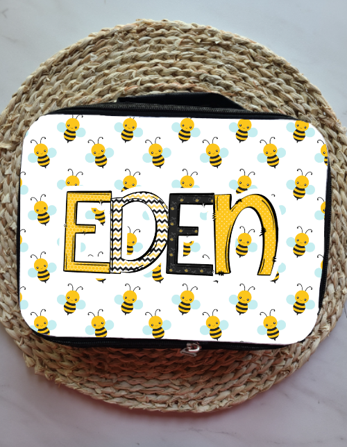 Lunch bag has a bee themed background with coordinating letters for your child's name on the top with black sides and bottom and a gray interior.