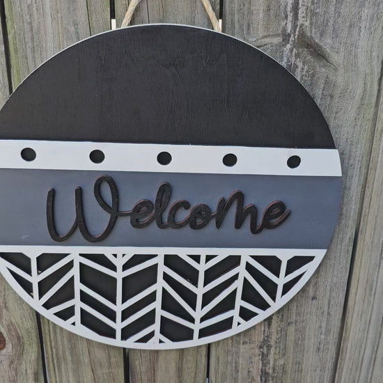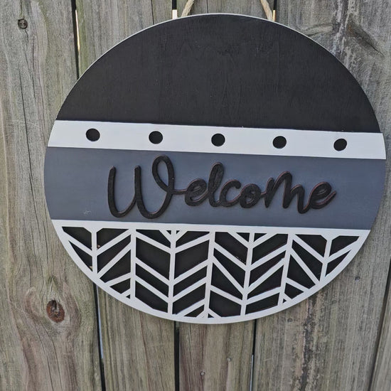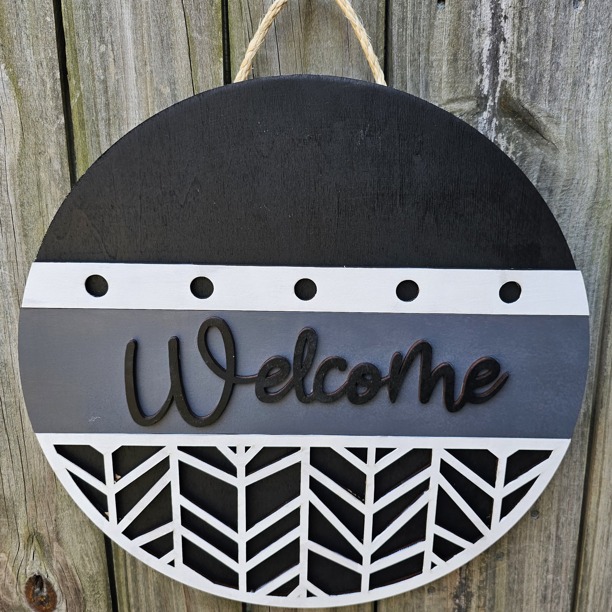 Welcome guests with sleek, modern style! This black, white, and gray layered “Welcome” door sign features a bold color palette, geometric cutout pattern, and clean layered lettering—making it a perfect year-round accent for any home.