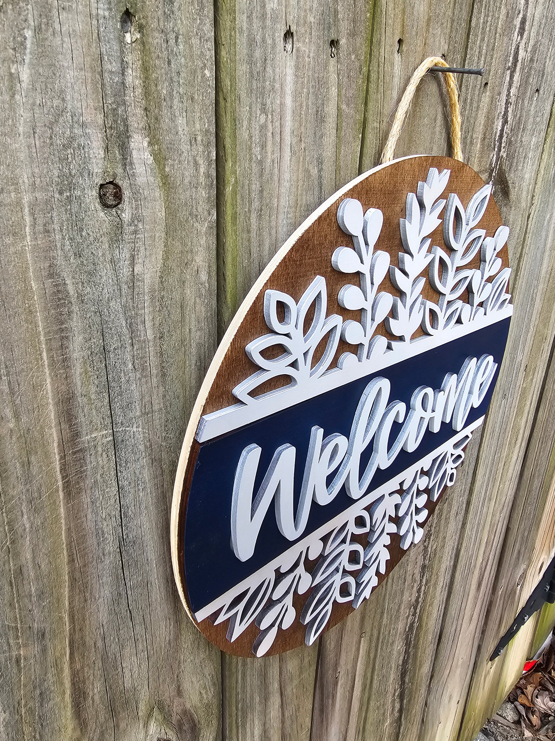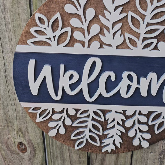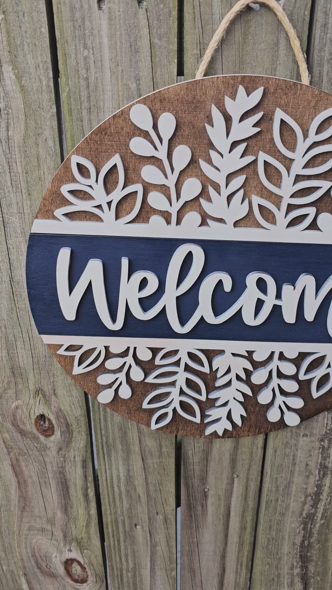 Add a warm, elegant touch to your front door with this layered botanical “Welcome” sign! Featuring crisp white greenery, a rich stained wood background, and a deep navy center band, this sign blends classic and modern style for a beautifully inviting look.