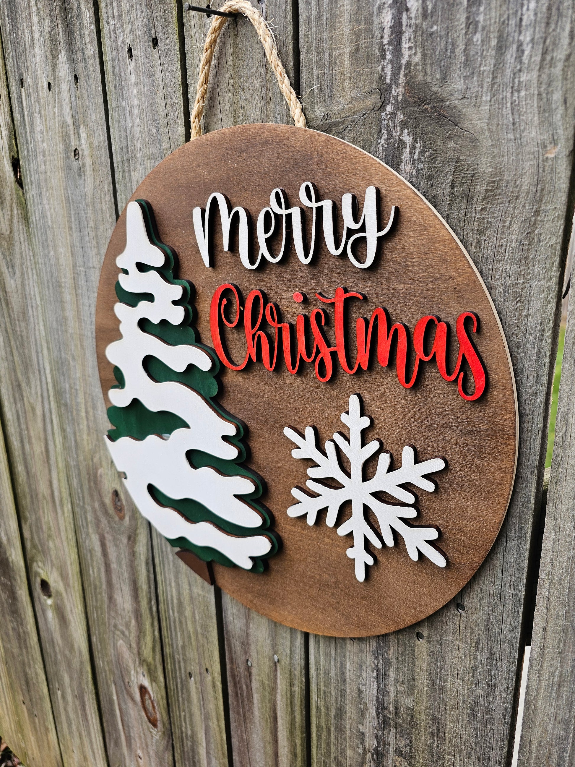 Bring festive cheer to your front door with this beautifully layered Merry Christmas round sign! Featuring a snowy evergreen tree, crisp snowflake, and traditional red-and-white holiday lettering, this handmade piece adds the perfect cozy touch to your holiday décor.