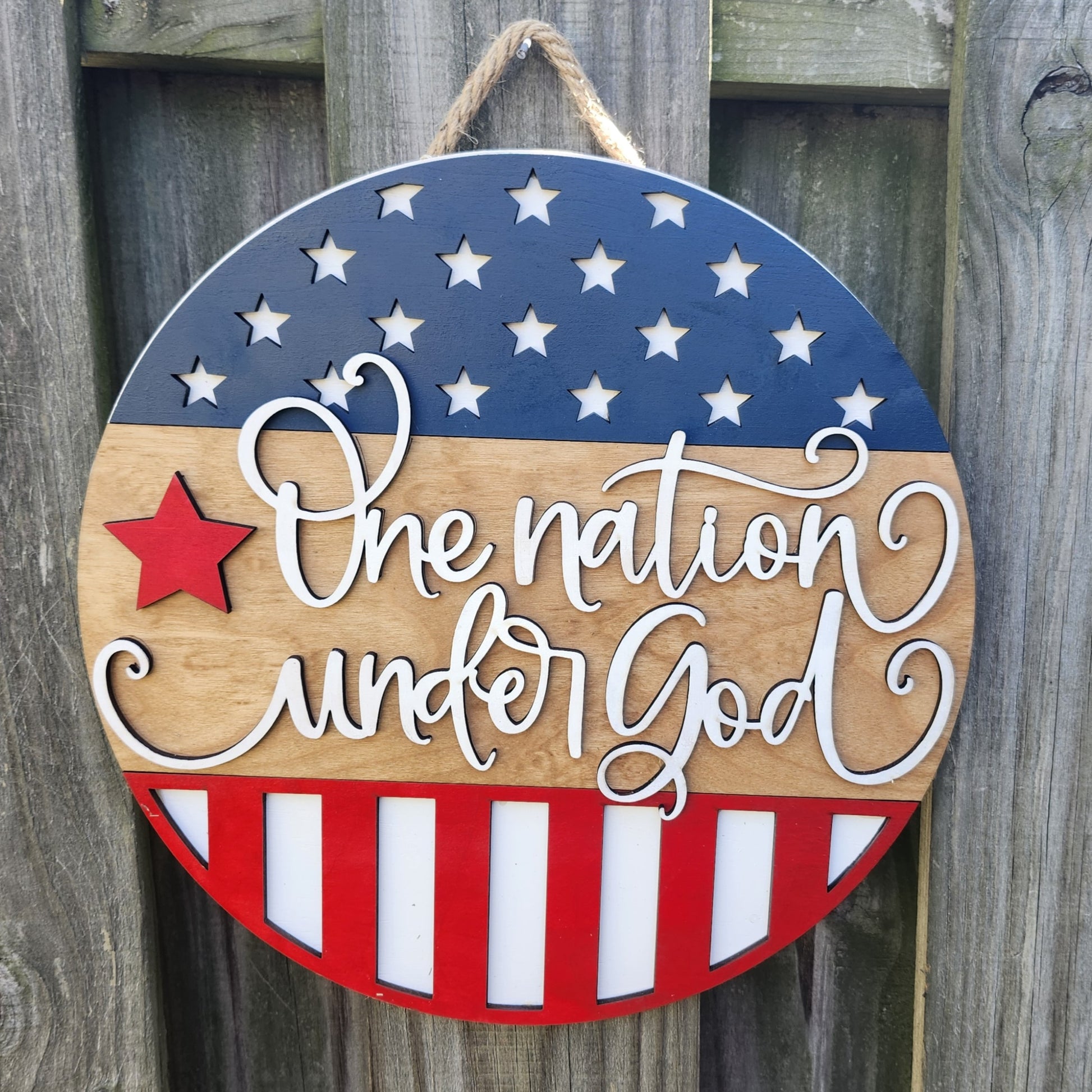 Make a statement! Welcome your guests with our One Nation Under God Wooden Door Hanging Sign. Crafted from wood, this 14" diameter sign is a great addition for any interior or exterior door. It’ll add a touch of character to your home! A best seller in person, it's now new to our site!