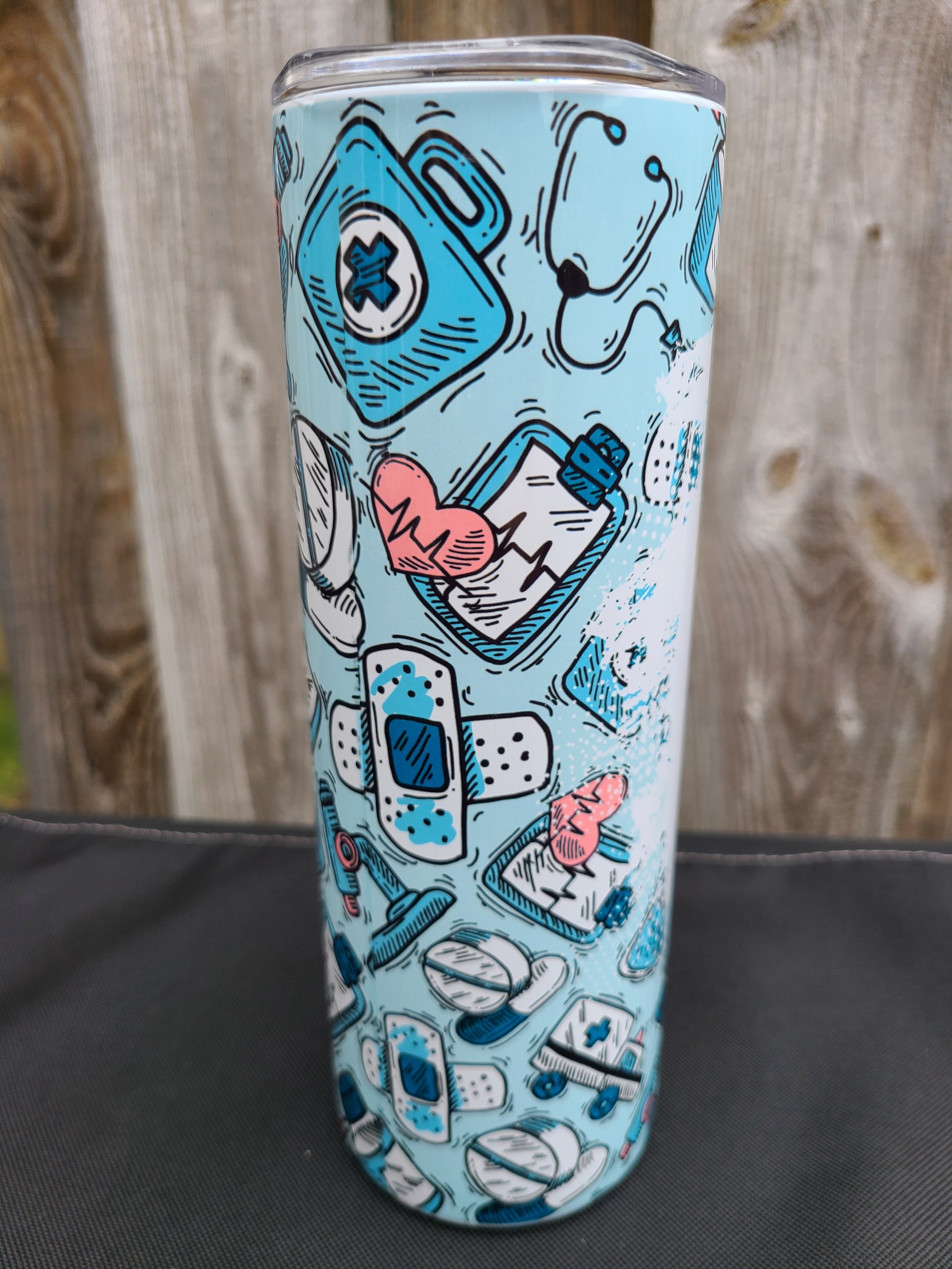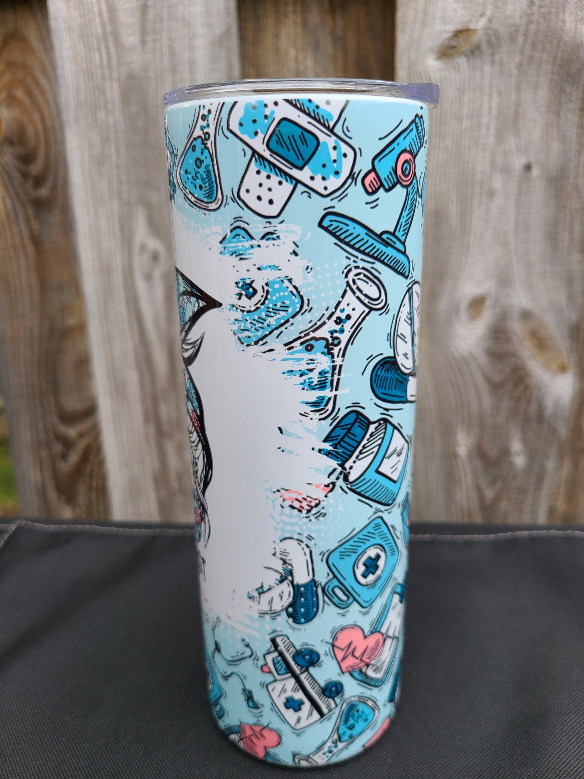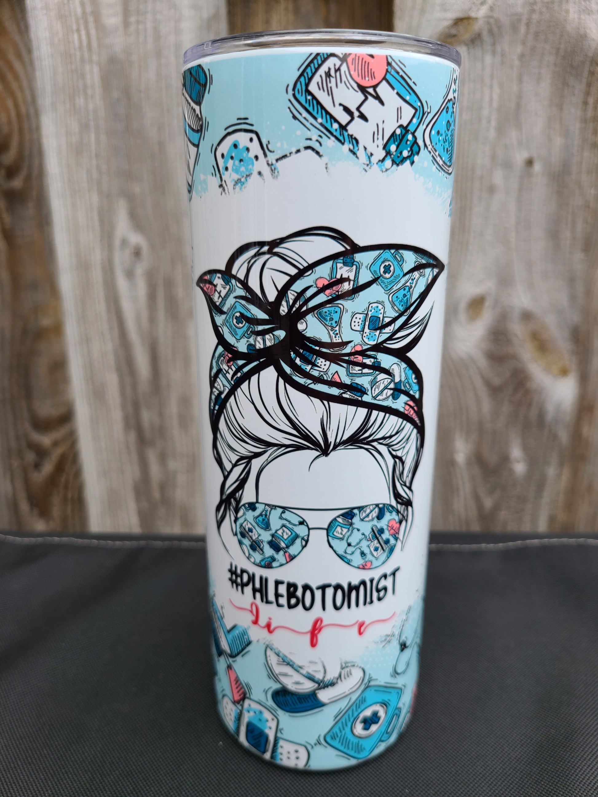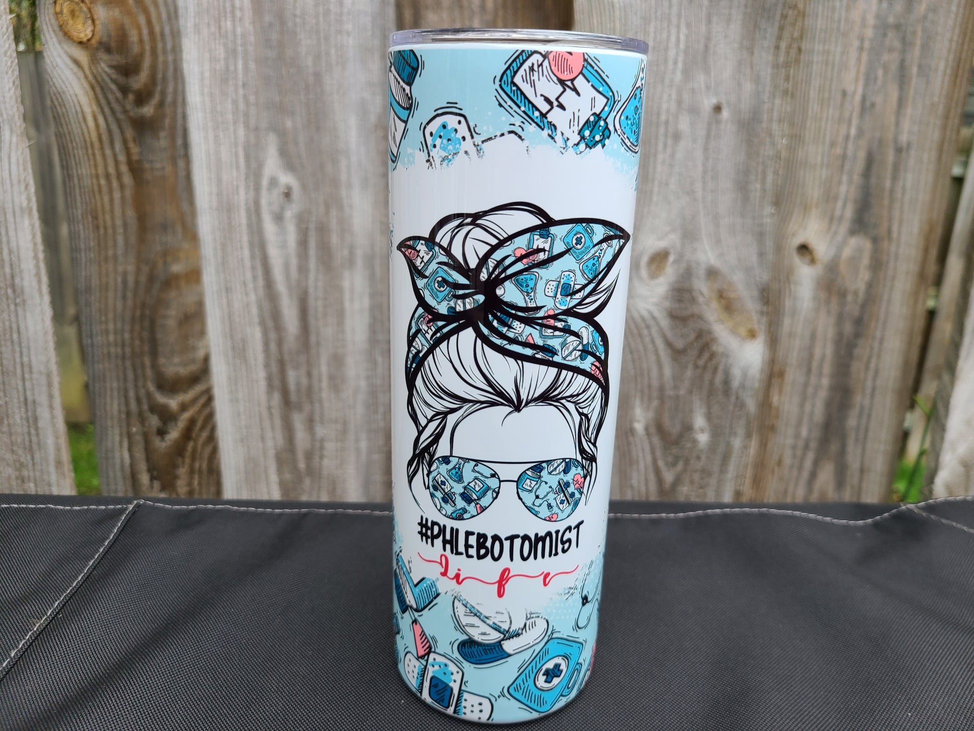 Phlebotomist Life messy bun design printed on a 20 oz skinny tumbler via sublimation. Great gift for a phlebotomy student, phlebotomy graduate, or an experienced phlebotomist! There is no epoxy, vinyl, or glitter used, only printed image, which allows for a smooth surface on the cup without the use of epoxy coating. The entire design is permanently printed directly on the cup.