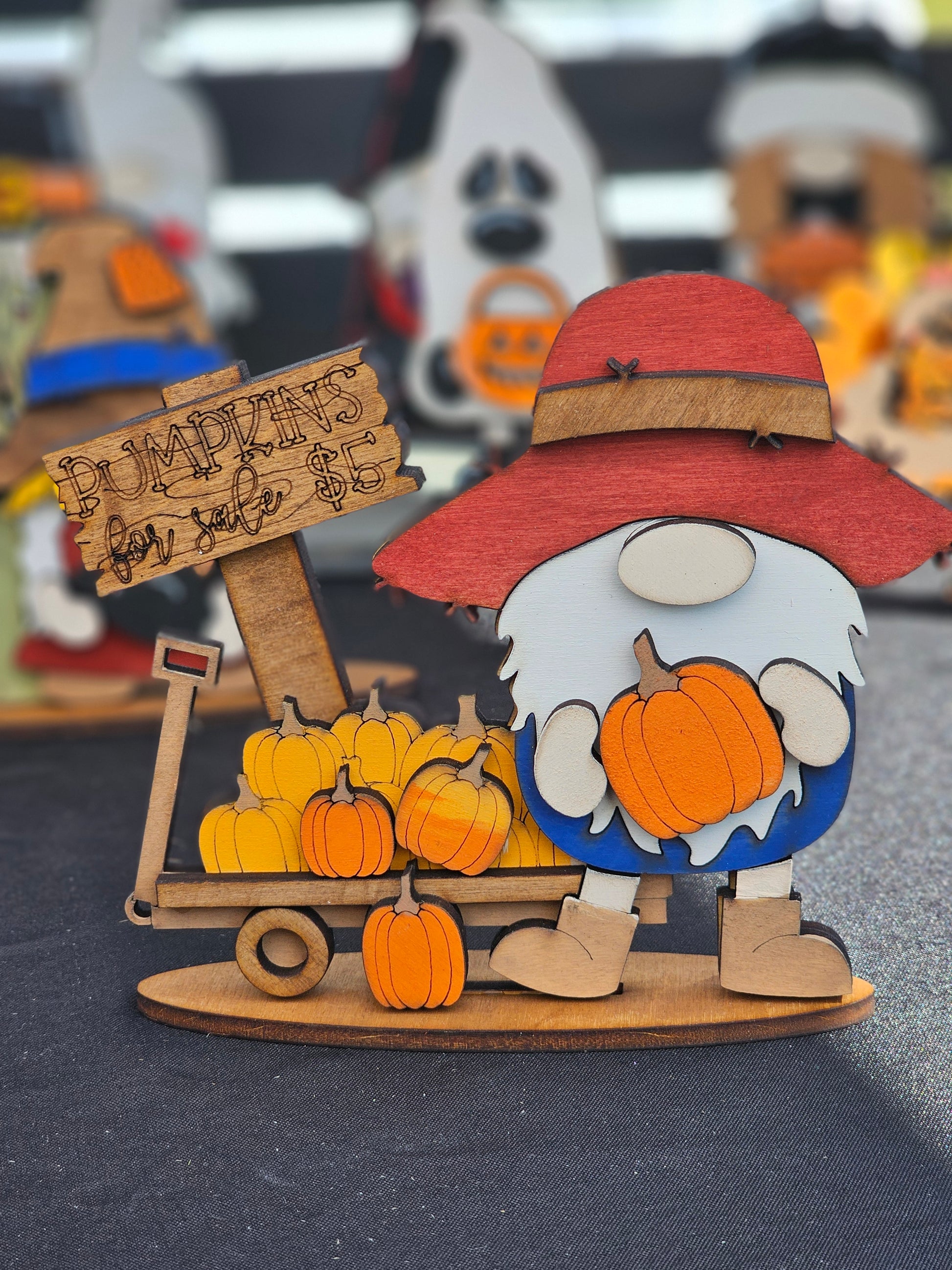This festive gnome is ready for the pumpkin patch! Wearing a wide red hat, he’s holding a bright orange pumpkin while standing beside a wagon overflowing with more pumpkins. A rustic wooden sign reading “Pumpkins for Sale $5” completes the scene, making him a playful nod to crisp autumn days and market stands. Full of hand-painted charm, he’s a perfect piece to add seasonal warmth to your shelves or tiered tray.