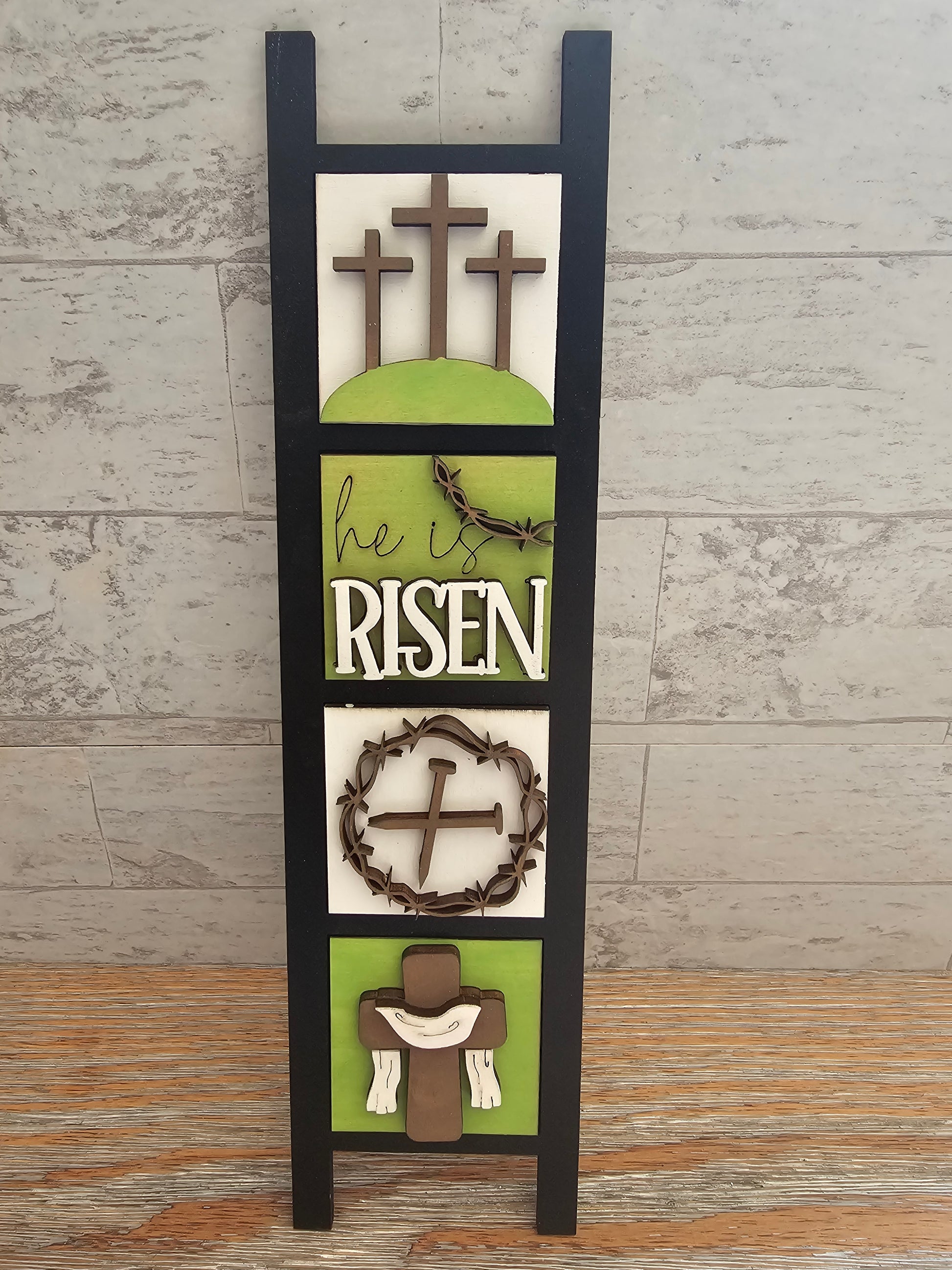 Our hand-painted Religious Easter Tile Set includes 4 wooden tiles featuring powerful Christian imagery: three crosses on a hill, a crown of thorns, the phrase “He is Risen,” and a cross draped with a white cloth. This set brings a faith-filled touch to your shelf or tiered tray during the Easter season and beyond.