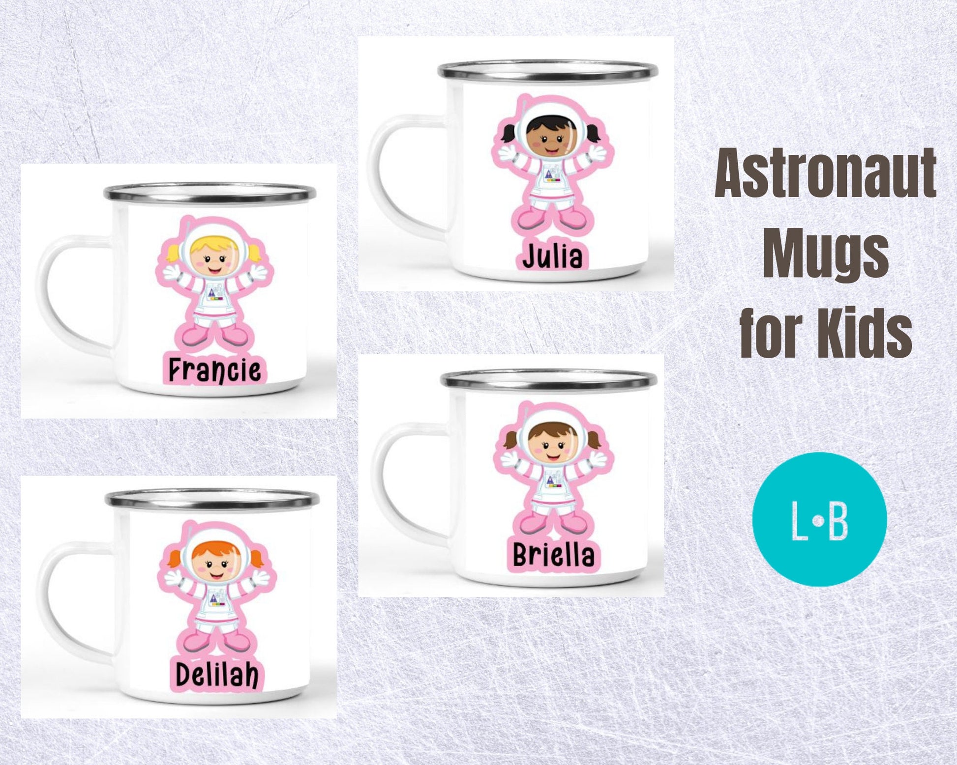 Looking for a unique gift for a space lover? Or an awesome party favor idea for a space or astronaut themed birthday party? These personalized enamel mugs for kids are perfect! Your choice of cartoon child image (choose from the name labeled on the image of the cup) with the recipient's name. Kids love these mugs! They're a camping style mug made of metal with enamel coating making them less fragile than traditional ceramic style coffee mugs. They can be used for hot beverages like hot cocoa or for drinking water, milk or other beverages, or could even be used to hold a snack like cereal or ice cream!