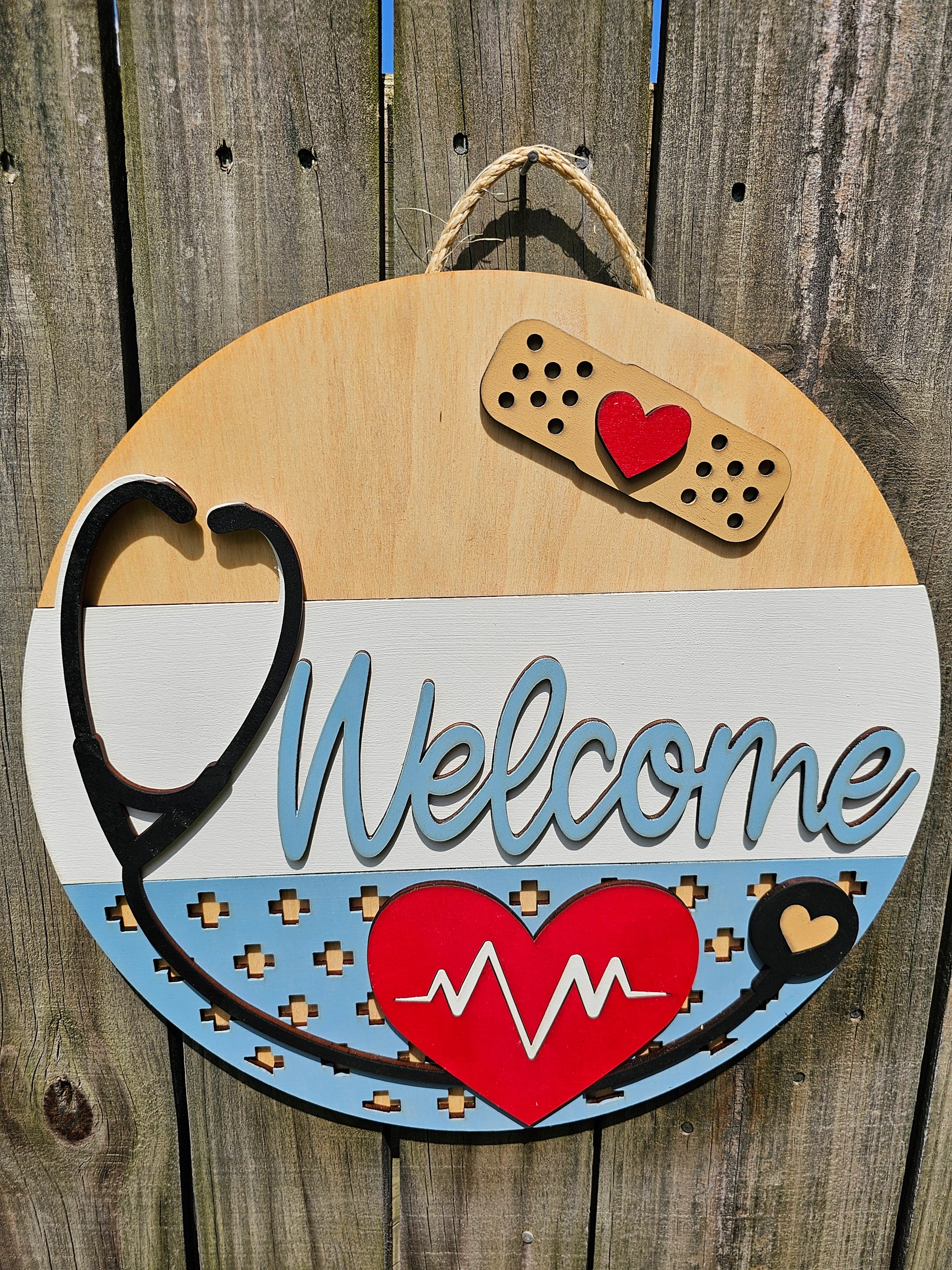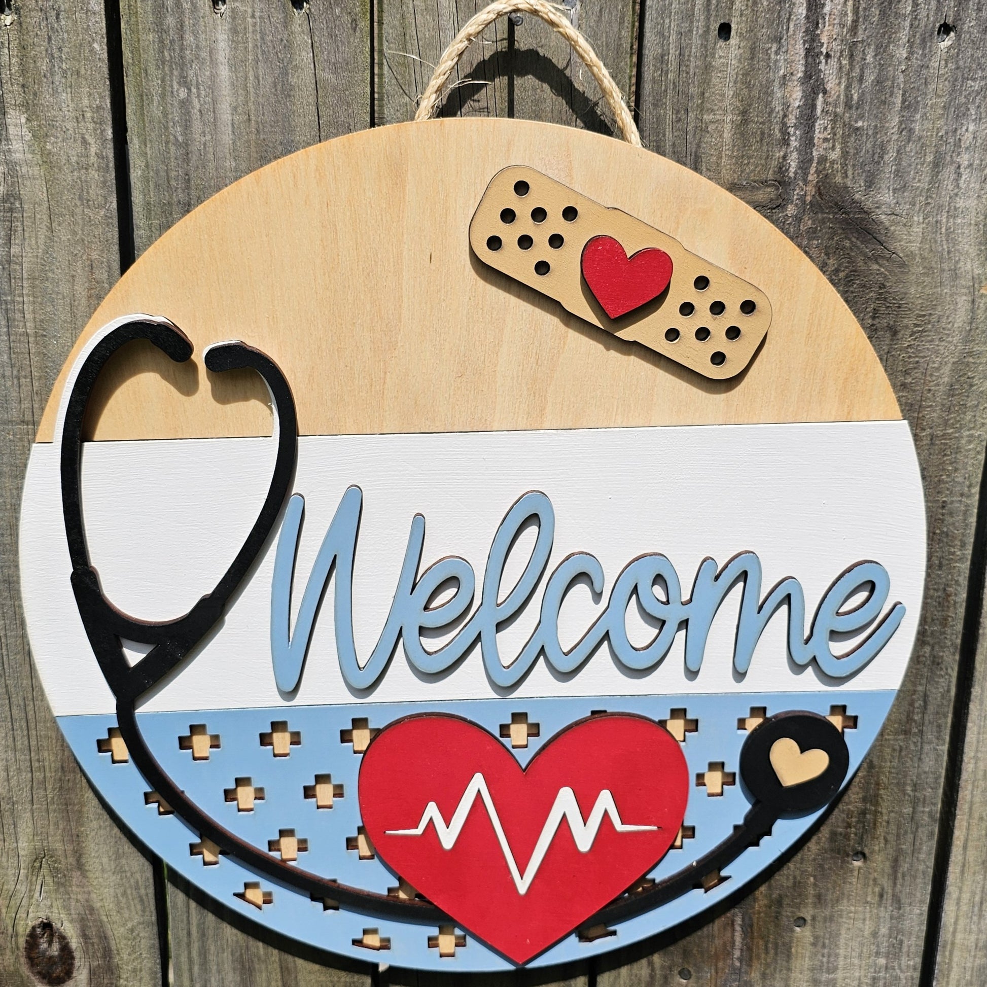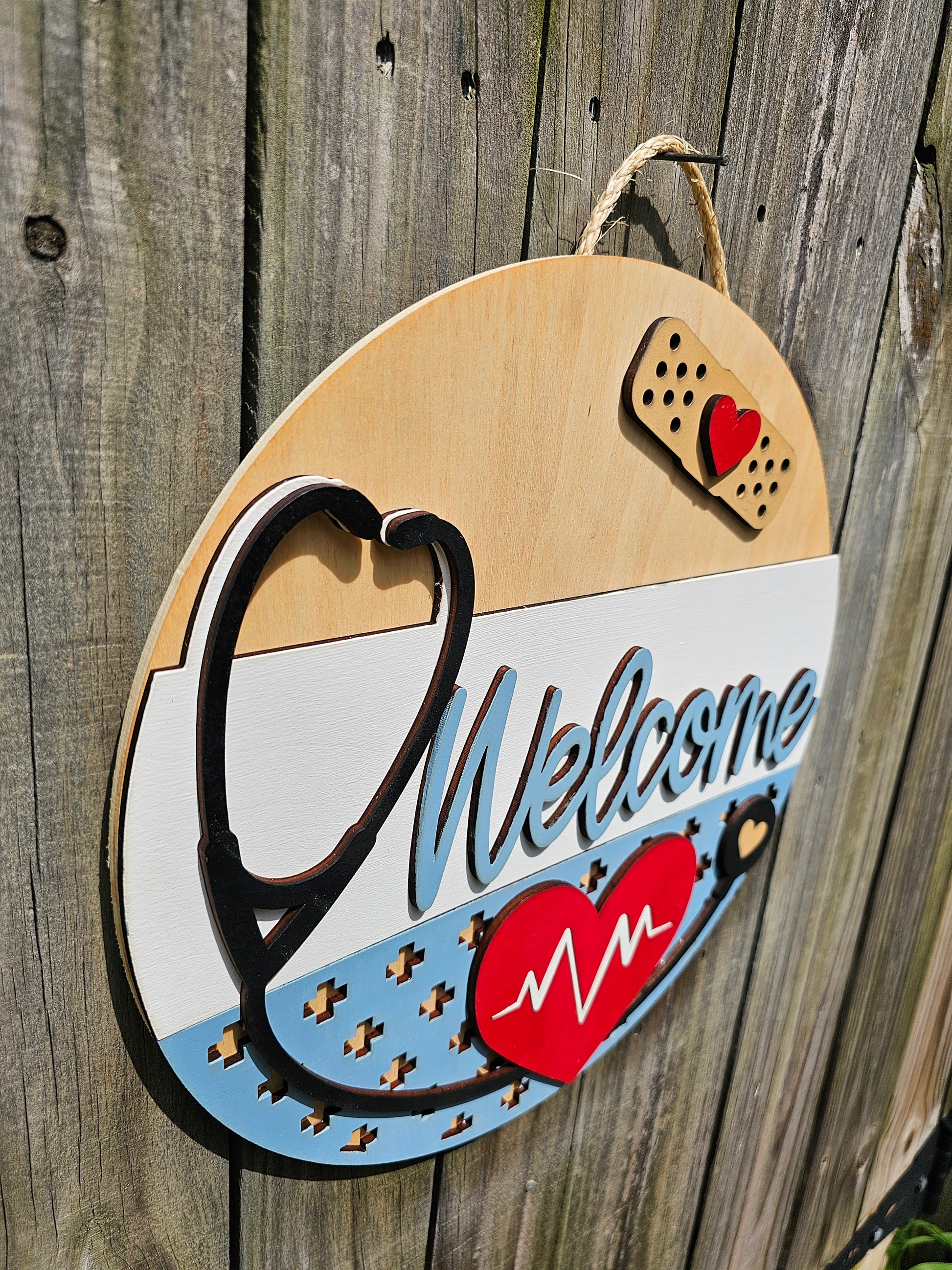 Design: Layered script “Welcome,” raised stethoscope, heartbeat heart, bandage with heart accent, and patterned cutouts on the lower section