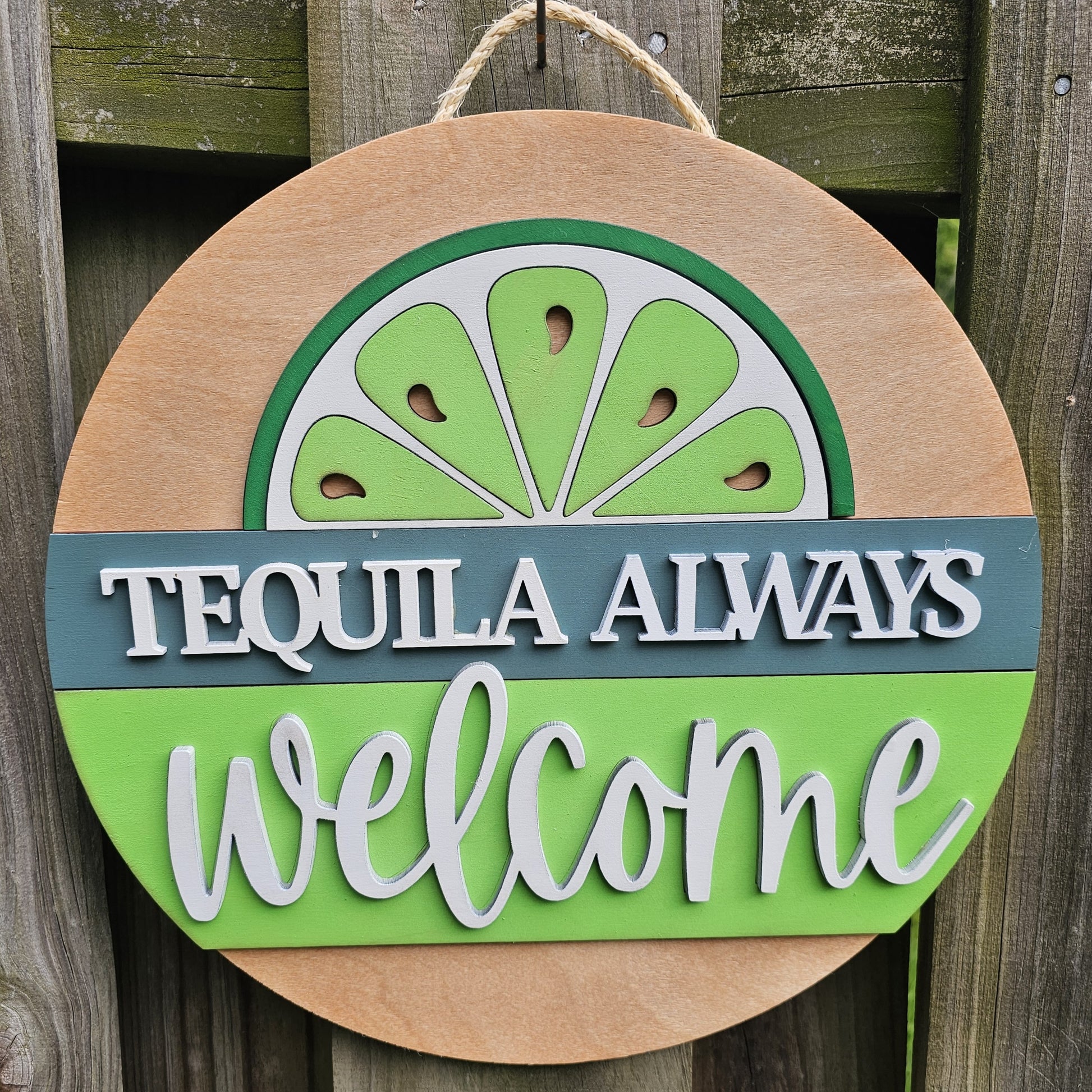Add a splash of fun to your porch with this playful “Tequila Always Welcome” door sign! Featuring a bright layered lime slice and bold script lettering, this sign is the perfect mix of cheerful and cheeky—ideal for patios, bar areas, poolside décor, or any home that loves a good margarita night.