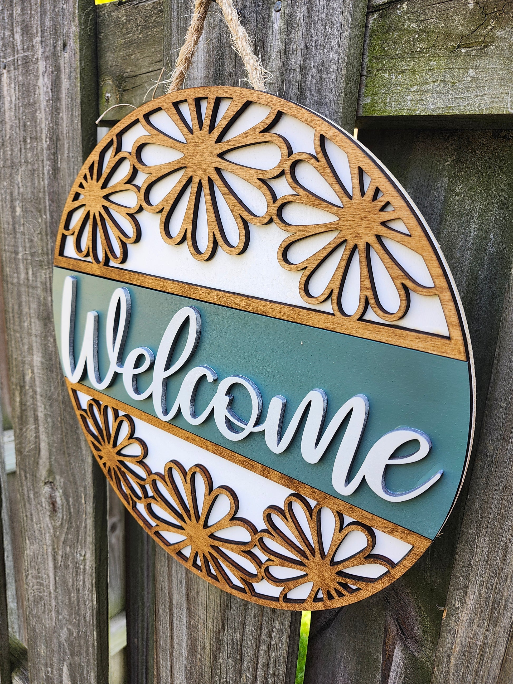 Design: Intricate daisy cutouts on the top and bottom, layered script “Welcome” across a sage-colored center band