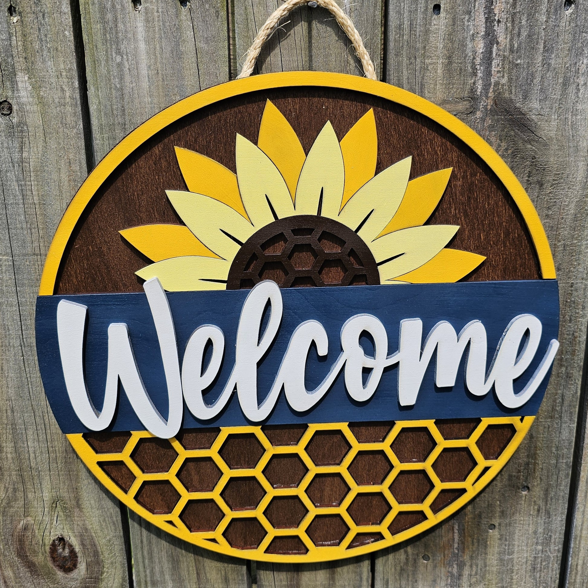 Design: Layered sunflower with honeycomb center, script “Welcome” across a navy band, and honeycomb cutouts on the bottom