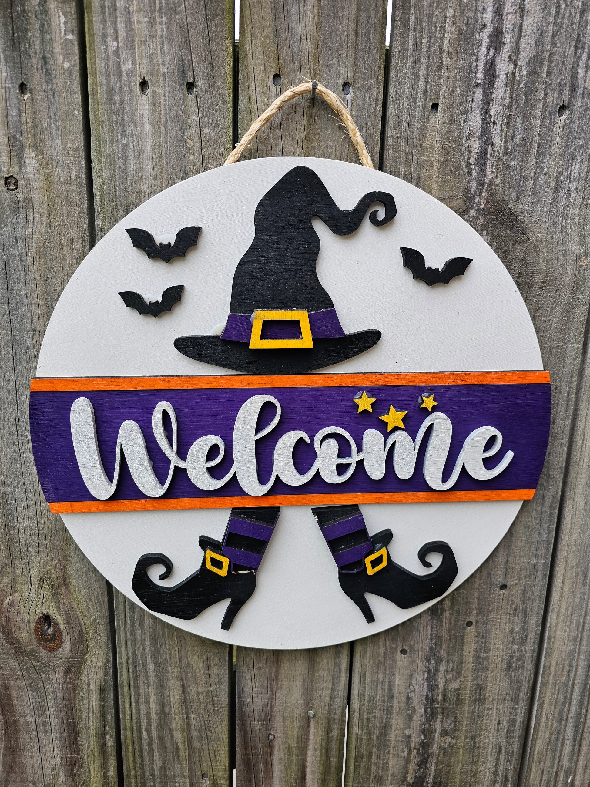 Add a little wicked charm to your front porch with this fun Halloween Welcome sign! Featuring a classic witch hat, striped boots, flying bats, and bold seasonal colors, this playful piece is perfect for spooky season lovers ready to celebrate all things October.
